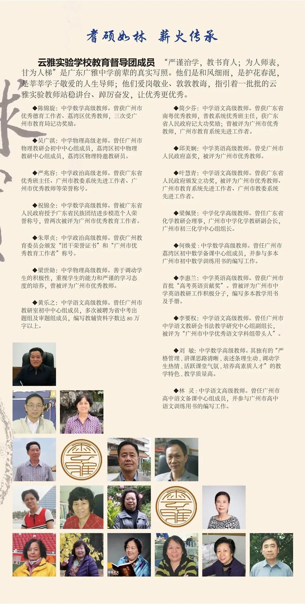 骨干教师:拥有广州市骨干教师13人、白云区骨干教师31人,涵盖数学、语文、英语、物理、化学等学科,教学经验丰富,多次在各级教学竞赛中获奖。