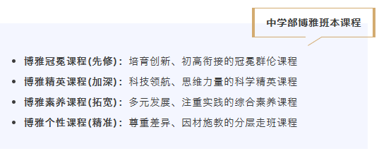 课程体系:构建了博雅冠冕课程、博雅精英课程、博雅素养课程、博雅个性课程、博雅融合课程、博雅拓展课程、研学旅行课程、综合实践课程等特色课程,满足不同层次学生的多样性需求。